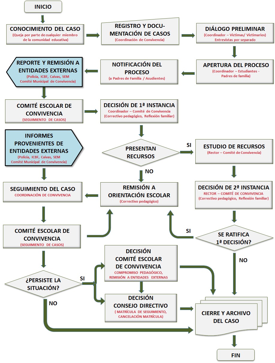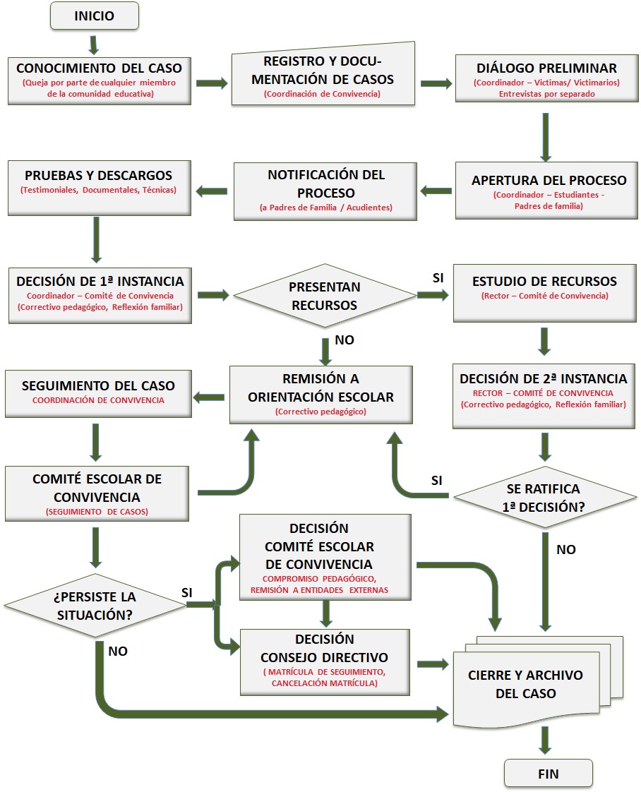 - Seguimiento y evaluación de casos por el comité escolar de convivencia y el consejo directivo.